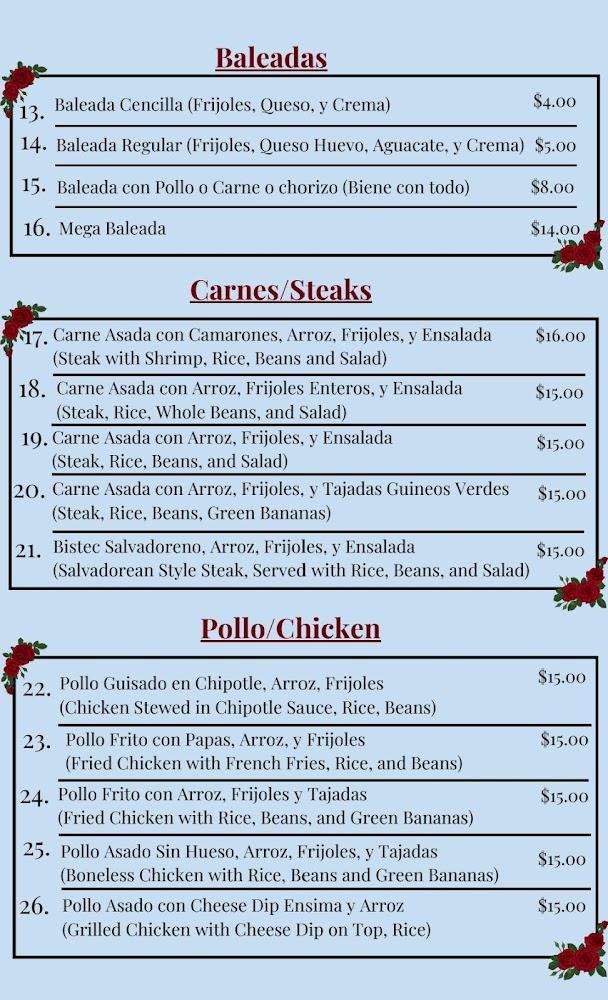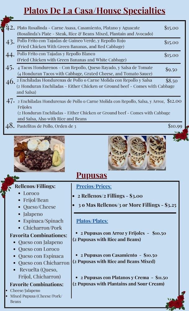 The menu at Rosalinda's showcases a range of traditional dishes from Honduran cuisine. The standout items include the beloved pupusas, filled with various ingredients like cheese, beans, and pork.